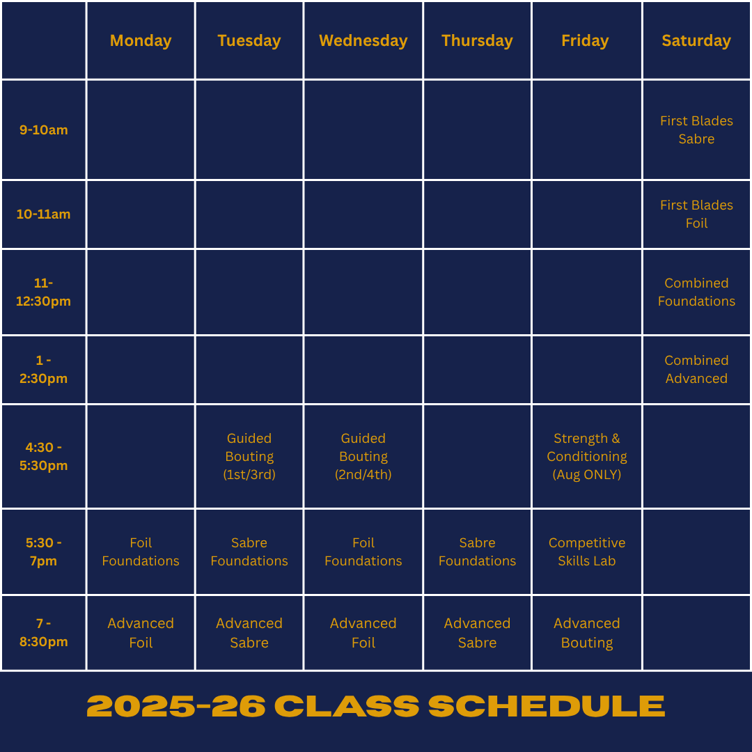 For fencers with experience, the Advanced class focuses on tactical development, bout strategy, and preparation for local and regional competitions. Athletes receive personalized feedback and are challenged to sharpen their decision-making, speed, and technical precision.